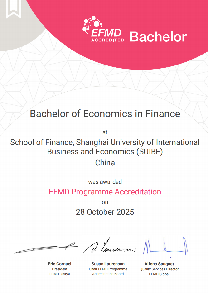 Recently, the undergraduate program in Finance offered by SUIBE’s School of Financial Management has been officially accredited by the European Foundation for Management Development (EFMD), with an initial accreditation period of three years. The EFMD accreditation is one of the most influential authoritative certifications in the field of global management education, renowned for its rigorous assessment criteria and comprehensive system. It serves as a significant hallmark of excellence in international business education. Achieving this accreditation signifies that the quality of SUIBE’s finance education has reached the internationally recognized first-class standard, cementing SUIBE’s leading position in finance education on the global stage.