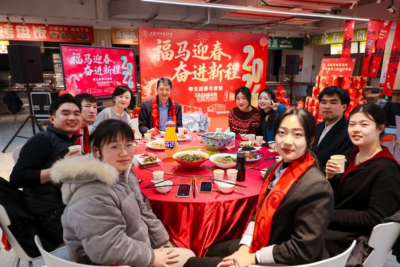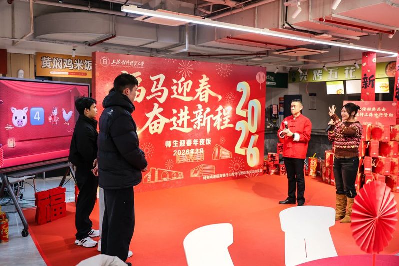 On the evening of February 11th, the student cafeteria on Songjiang Campus of SUIBE was festively lit and decorated as SUIBE hosted a Chinese New Year's Eve dinner for the 2026 Year of the Horse. SUIBE President Wang Rongming, Deputy Chairman of the University Council of SUIBE and Vice President Shen Yi, together with teacher representatives from administrative departments and schools, joined the dinner and celebrated the festival with more than 100 students staying on campus during the winter vacation.